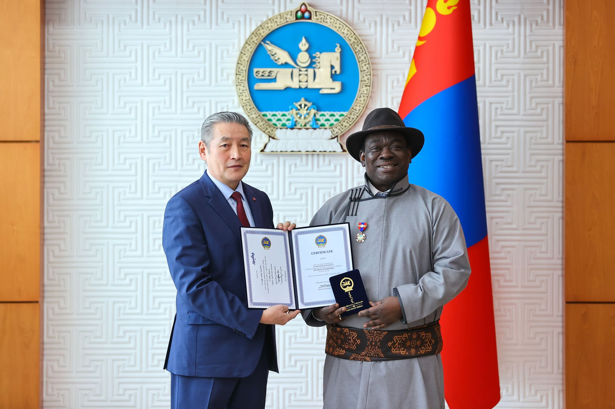 Монгол Улсын Ерөнхийлөгч Ухнаагийн Хүрэлсүхийн зарлигаар НҮБ-ын Хүүхдийн сангийн Суурин төлөөлөгч Эваристе Коуасси-Комлан-ыг “Найрамдал” медалиар шагнасныг Монгол Улсын Ерөнхийлөгчийн Ахлах зөвлөх Н.Хүрэлбаатар гардуулав.