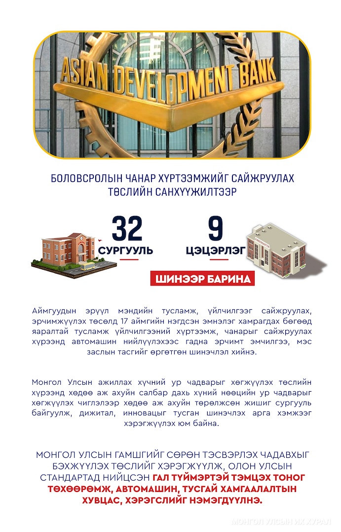Эдийн засгийн хүндрэлийн үед боловсролын чанар хүртээмжийг сайжруулах төсөл-2 дахь нэмэлт санхүүжилтээр орчин үеийн стандарт, ногоон орчныг бүрдүүлсэн 32 сургууль, 9 цэцэрлэг шинээр барих юм. Ингэснээр нэг ангид суралцах хүүхдийн тоог бууруулж, гурван ээлжээр хичээллэхийг багасгана гэж тооцжээ.