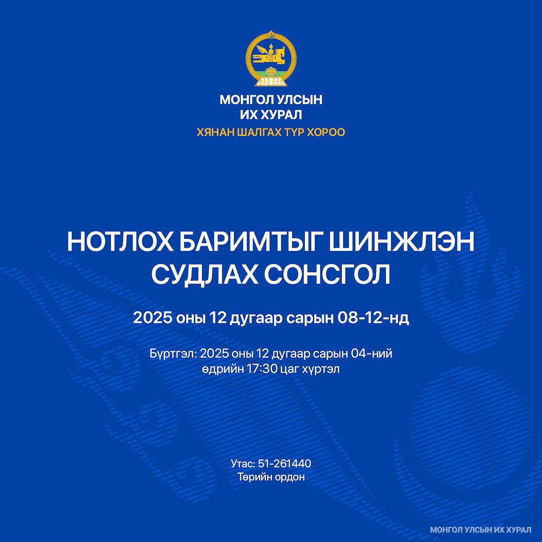 Монгол Улсын Их Хурлын 2025 оны 62 дугаар тогтоолоор байгуулагдсан “Оюу толгой бүлэг ордын ашиглалтад Монгол Улсын эрх ашгийг хангуулах, хүртэх өгөөжийг нэмэгдүүлэхтэй холбоотой баримт бичиг, үйл ажиллагаанд хяналт шалгалт хийх” үүрэг бүхий Хянан шалгах түр хорооноос нотлох баримтыг шинжлэн судлах сонсголыг 2025 оны 12 дугаар сарын 08-12-ны өдрүүдэд Төрийн ордны “Их Эзэн Чингис хаан” танхимд зохион байгуулах тул иргэн, хуулийн этгээд, хэвлэл мэдээллийн байгууллагын төлөөлөл Та бүхнийг оролцохыг урьж байна.