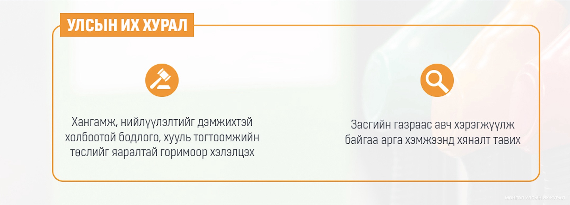 Тус хуулиар Монгол Улсын Их Хурлын стратегийн ач холбогдол бүхий бүтээгдэхүүний хангамж, нийлүүлэлтийг дэмжихтэй холбоотой бодлого, хууль тогтоомжийн төслийг хэлэлцэн батлах; энэ чиглэлээр Засгийн газраас авч хэрэгжүүлж байгаа арга хэмжээнд хяналт тавих бүрэн эрхийг хэрэгжүүлэх зохицуулалттай.