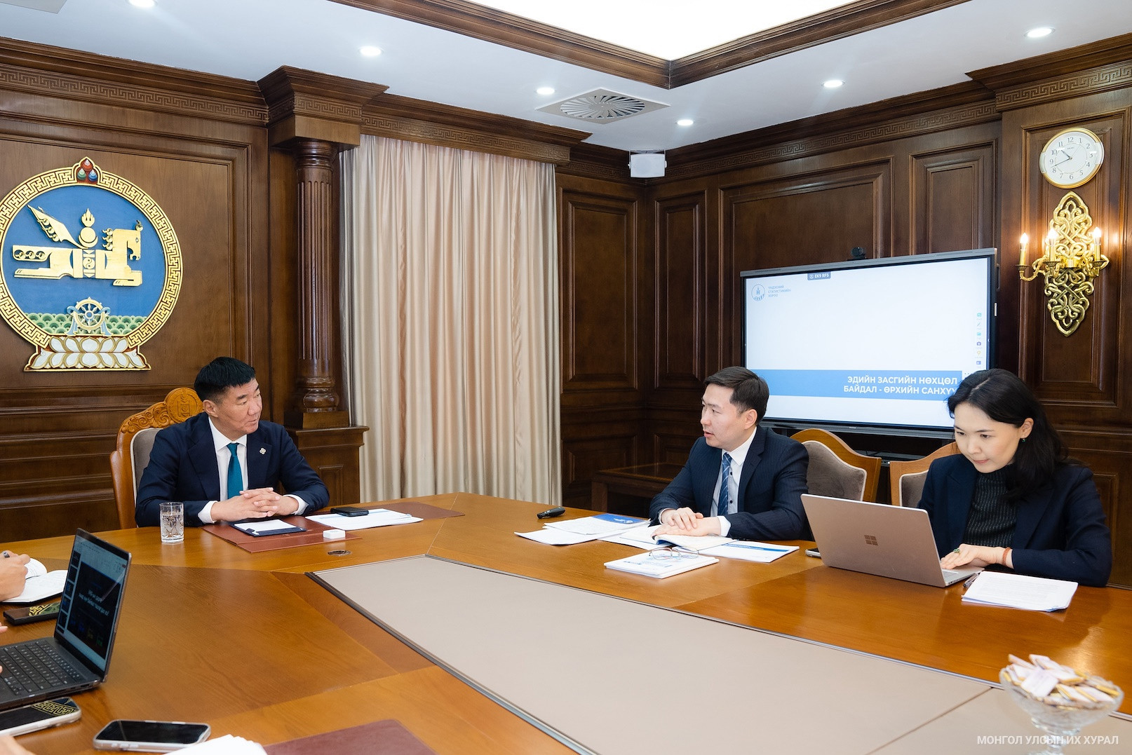 Үндэсний статистикийн хорооны дарга Б.Батдаваа “Эдийн засгийн нөхцөл байдал-өрхийн санхүү” сэдвээр мэдээлэл хийж, нийгэм, эдийн засгийн үндсэн үзүүлэлтүүд, цаашид анхаарах асуудлуудын талаар дэлгэрэнгүй танилцуулав.